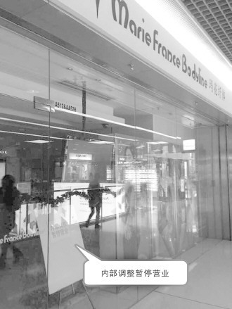 图为玛花纤体北京东方广场店门口张贴“内部调整暂停营业”的告示。