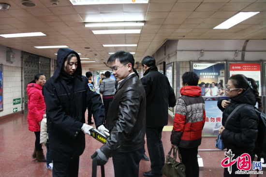 2013年12月16日,北京天安门西站地铁站内两名安检员对乘客进行安检。中国网记者 李佳摄影