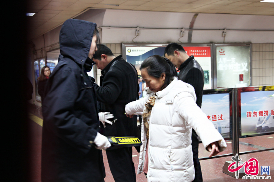 2013年12月16日,北京天安门东站地铁站内安检员对乘客进行安检。中国网记者 李佳摄影