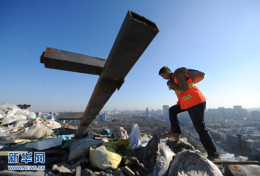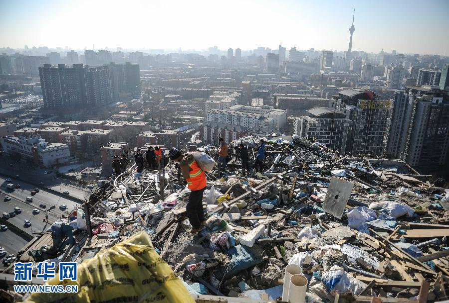 12月19日,工人在人济山庄小区B栋楼顶清理建筑垃圾。当日,北京海淀城管执法监察局紫竹院队工作人员检查现场后认为,人济山庄小区B栋楼顶违法建设的主体部分已基本拆除完毕,目前工人正在进行建筑垃圾的清理搬运工作。据了解,由于高空施工难度大,只能靠工人手工操作,且整栋楼只有一部货运电梯,所以建筑垃圾清理工作还无法在短时间内结束。城管部门表示已经要求业主在自行拆除清理完成后及时汇报。届时城管将协同相关部门按照楼房的原始图纸进行验收,只有验收合格,整个拆除工作才能算真正结束。新华社记者 罗晓光 摄 图片来源:新华网