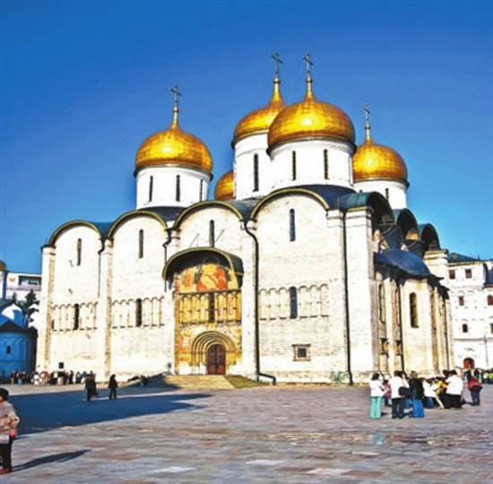 北青报记者注意到,这些建筑的金顶及外部装饰与克里姆林宫的金顶钟楼及教堂十分相似——顶部一个或几个大小不一的金色球体,墙体刷成白色,窗户为弧形。