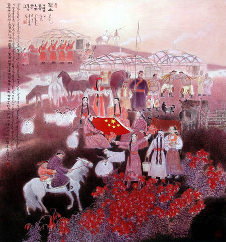 敖特的画域甚广,山水、花鸟、人物、动物,无所不精。尤其是近年来,为了讴歌和谐社会,歌颂大草原,敖特创作了一批反映少数民族热爱祖国,热爱内蒙古草原题材的作品。其中,《聖土》这幅作品,集中体现了草原人民在党和政府的正确领导下,热爱生活、与时俱进的喜庆场面和繁荣景象。看那欢声笑语、载歌载舞的姑娘们手中的五星红旗,增强体育运动,摔跤的男青年,旁观的牧民,蒙古包前翩翩起舞的美丽姑娘,手持马头琴的小伙,前来观摩演出,骑在白马背上的一老一少,画面远景中,坐在马背上手握套马杆的青年小伙和姑娘。加上可爱的羊群,农家的小狗,如痴如醉的老牛,蒙古包冉冉升起的炊烟。蒙古族文字与汉族文字的巧妙组合,合理搭配,交织成一幅欣欣向荣的和谐画面。把整幅作品刻画的满而不塞、淋漓尽致,让人观后耳目一新、留恋忘返。