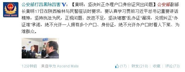 中新网1月17日电 据公安部治安管理局、公安部“打四黑除四害”专项行动办公室官方微博消息,公安部副部长黄明17日在陕西榆林与民警座谈时要求,要认真学习贯彻习近平总书记重要讲话精神,坚持执法为民,正视问题、改进不足,坚决堵塞“乱办证”漏洞,兑现纠正“办证难”承诺,绝不允许一人拥有多个户口、身份证,绝不允许办户口时看人下菜、为难群众。