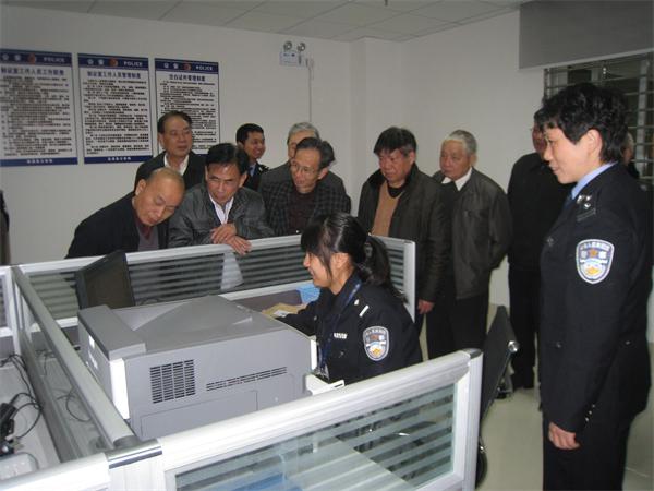 图为安溪县公安局退休老领导、老同志们正在港澳签注室观看出入境民警制证。(通讯员:福建省泉州市 颜建全 林双)