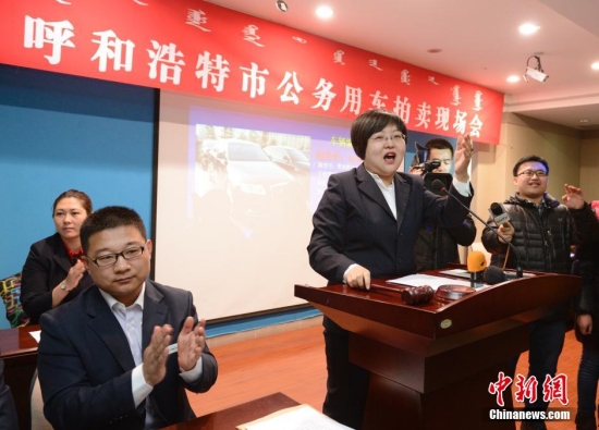 1月26日,拍卖会现场,一位竞拍买家多次举牌,引起其他买家掌声。当日,内蒙古呼和浩特首批19辆超标公务车公开拍卖,19辆车全部为奥迪汽车。最高成交价为一台已行驶7万4千多公里的FV7201TFCVTG奥迪车,起拍价17万,成交价28.1万元;最低成交价为一台已行驶34万多公里的A6L1.8TAT奥迪车,起拍价2万,成交价6.6万元。中新社发 刘文华 摄