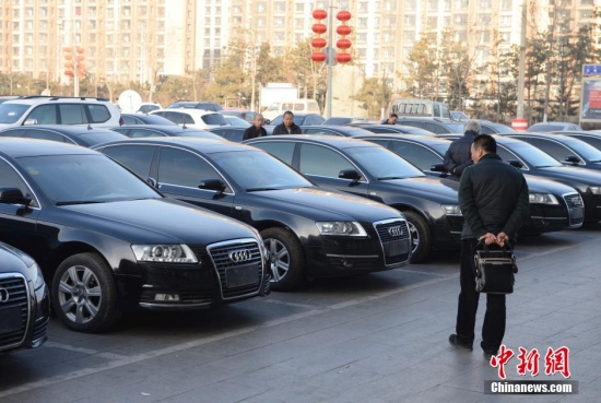 1月26日,竞标的买家在看车况。当日,内蒙古呼和浩特首批19辆超标公务车公开拍卖,19辆车全部为奥迪汽车。最高成交价为一台已行驶7万4千多公里的FV7201TFCVTG奥迪车,起拍价17万,成交价28.1万元;最低成交价为一台已行驶34万多公里的A6L1.8TAT奥迪车,起拍价2万,成交价6.6万元。中新社发 刘文华 摄