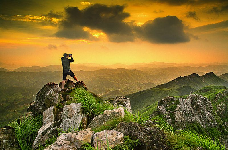 大云山是邵东最高峰,海拔998.4米,自然是观日出日落的理想去处。观日出你得劳点体力,付点汗水,到最高峰鸡冠峰最为妥当。站在山巅,你可四处眺望,一边是邵东县,另一边是衡阳县。目光所及,远远近近的山脉,都在你的征服之下。驻立山顶,山风徐来,伸展双臂,拥星入怀;振臂一呼,群山呼应,气势磅礴。这时,你徒然而生“会当凌绝顶,一览众山小”的豪迈。天边渐渐变红,层层山峦如戏台帷幕,等待拉开的一霎那。黄山日出峻美,泰山日出壮观,大云山日出洒脱。红红的太阳迈出山际,便整个亮在你的面前,惺忪着,似乎半梦半醒。此时,你与鸡冠峰的石,都被染上童话般的红褐色。山脚下的村居,披翠的田野,小跑的水泥乡道,赶早的炊烟,在晨光渲染下,有着不一般的空寂与灵明。这份美,美在安谧,美在淡雅,陶醉其中,心境澄净而释然。