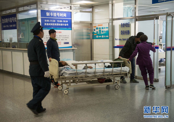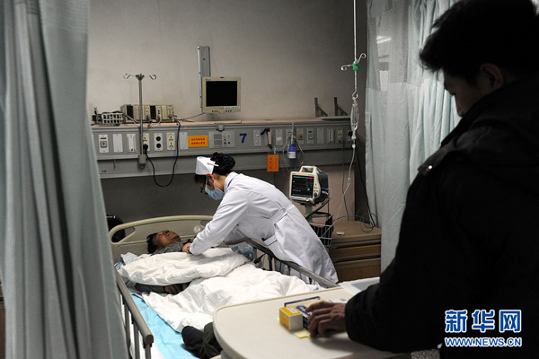 12月29日,一名受伤的工人在北京市海淀医院接受救治,他的工友在旁边等待(右)。当日上午,位于北京市海淀区清华附中一在建工地底板钢筋在绑扎过程中发生坍塌,事故直接造成在现场作业的10名工人死亡,4人受伤,伤者已被送往医院救治,目前生命体征平稳,无生命危险。新华社记者 何俊昌 摄