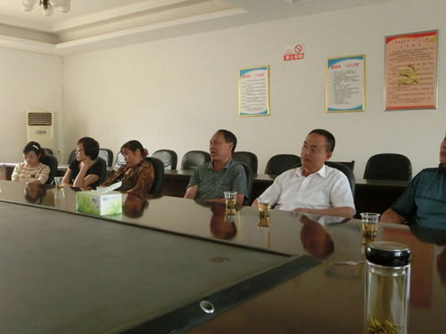 图为张进(左二)李瑞(左一)陈刚(右二)王先冲(右一)等到明珠建村总厂听取庄辉元汇报