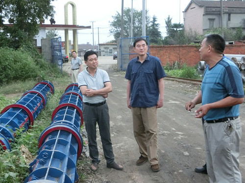 图为张进(中)等一行到明珠建村总厂电杆车间现场察看