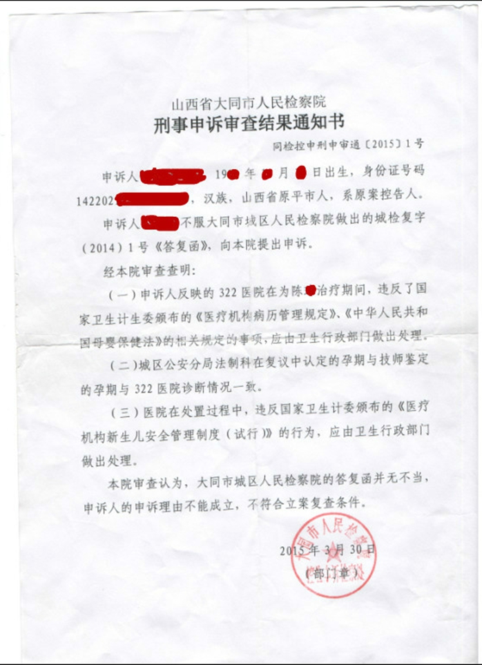 322医院病例、陈某孕期B超单、大同市检察院出具的答复函、刑事申诉审查结果通知书