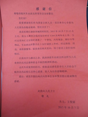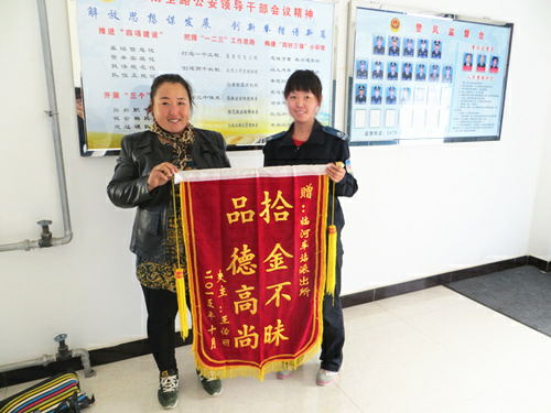 在感激之余失主母亲拿出准备好的感谢信及书写着“拾金不昧·品德高尚”的锦旗,赠予了民警。(通讯员:包头铁路公安处宣传教育室 李兆惠 )