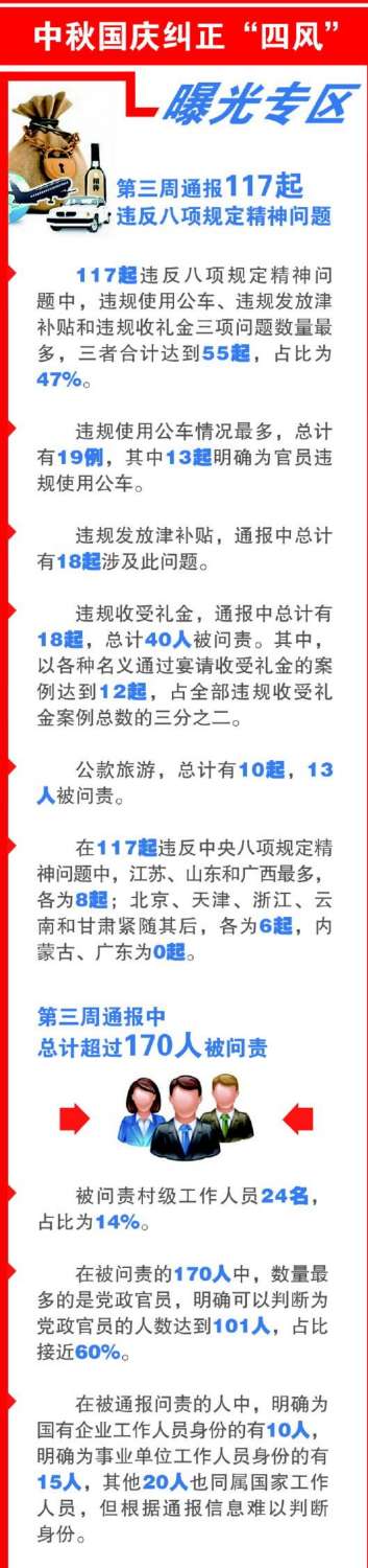 9月30日,中央纪委监察部网站“中秋国庆纠正‘四风’监督举报曝光专区”发布了第三周通报,总计通报了117起违反中央八项规定精神问题。