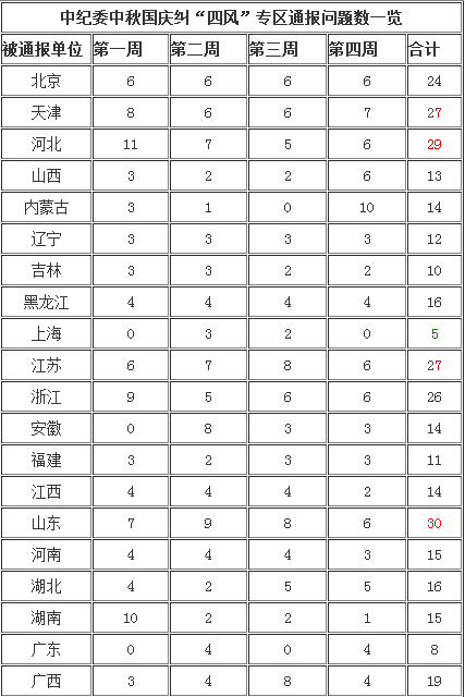 中秋国庆两节前,为紧盯重要时间节点,加大社会监督力度,畅通举报渠道,中央纪委监察部网站开设“中秋国庆纠正‘四风’监督举报曝光专区”。9月16日,该专区通报了首批被各级纪检监察机关查处的128起违反中央八项规定精神典型问题。中纪委将全国划分为31个省份,新疆生产建设兵团,中央和国家机关/国企、金融机构共33个单位加以统计,除上海、安徽、广东3省份外,其余30个单位均有人因违规发放津贴补贴、公款旅游、违规送礼收礼、公款吃喝等问题被点名道姓加以通报。