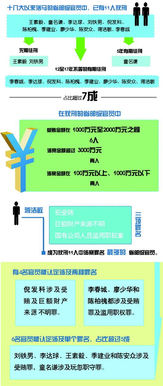 《法制日报》记者统计显示,在十八大以来落马的省部级官员中,包括李春城和蒋洁敏在内,共有11名省部级官员获刑。