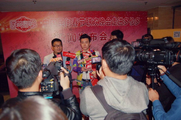 由风雷、王芳、苗伟、雅娟主持,发布会现场星光大道08年冠军张羽演唱了《落叶》、著名女高音歌唱家,中国古典诗词传承人王舒芬身穿古装服饰表演了《西江月》古诗词。刘爽《我不想再醉》、刘思伟《炎黄子孙》、曾雨轩《风情万种》、金娃《向阳花》、龙子东升组合《正义》纷纷表演了新作。张绍飞、张艺源、彭三、孙辉、王海滨等百名明星到场助阵!戴玉强、金波、草帽姐、谢东等都录制了VCR表示祝贺!现场人气爆棚。民间春晚总导演杨志平和导演东方骏分别发表了讲话,回顾过去七年里民间春晚的艰难历程,感慨民间春晚八岁了,八年的坚持,尽管经历重重困难,运作经费资金拮据,但在社会各界和艺员的共同支持下,节目组终于凭借努力奋斗和接地气的民间精品,即将走出国门,走向世界!歌手王可儿了解民间春晚一路走来的艰辛历程当场捐款三万,在此倡导下爱心人士纷纷赞助捐款,助民间春晚越办越好!