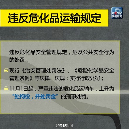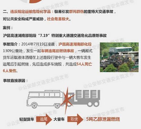 2、违反规定运输危险化学品:极易发生群死群伤的重特大交通事故,对公共安全构成严重威胁