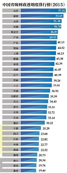 新京报讯 (记者沙璐)我国政府财政信息公开程度究竟如何,昨天,上海财经大学财政透明度课题组公布了《2015中国财政透明度报告》。报告中,中国省级财政透明度指数(2015)描述了我国31个省份2013年度决算的财政信息公开程度,其中,山东以57.01分位居榜首,贵州以19.44分垫底,北京位居第15名。