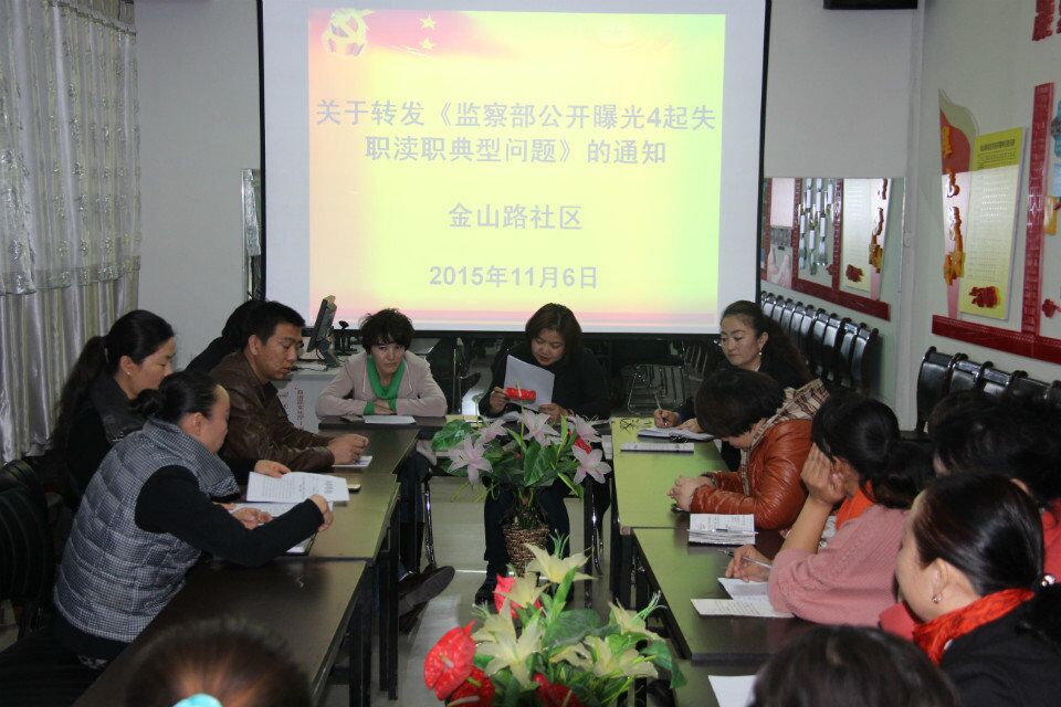 清风网讯:(通讯员 谷粒)11月6日,金山路社区组织开展《监察部公开曝光4起失职渎职典型问题》通报学习,“访惠聚”工作组成员及社区干部20余人参加。
