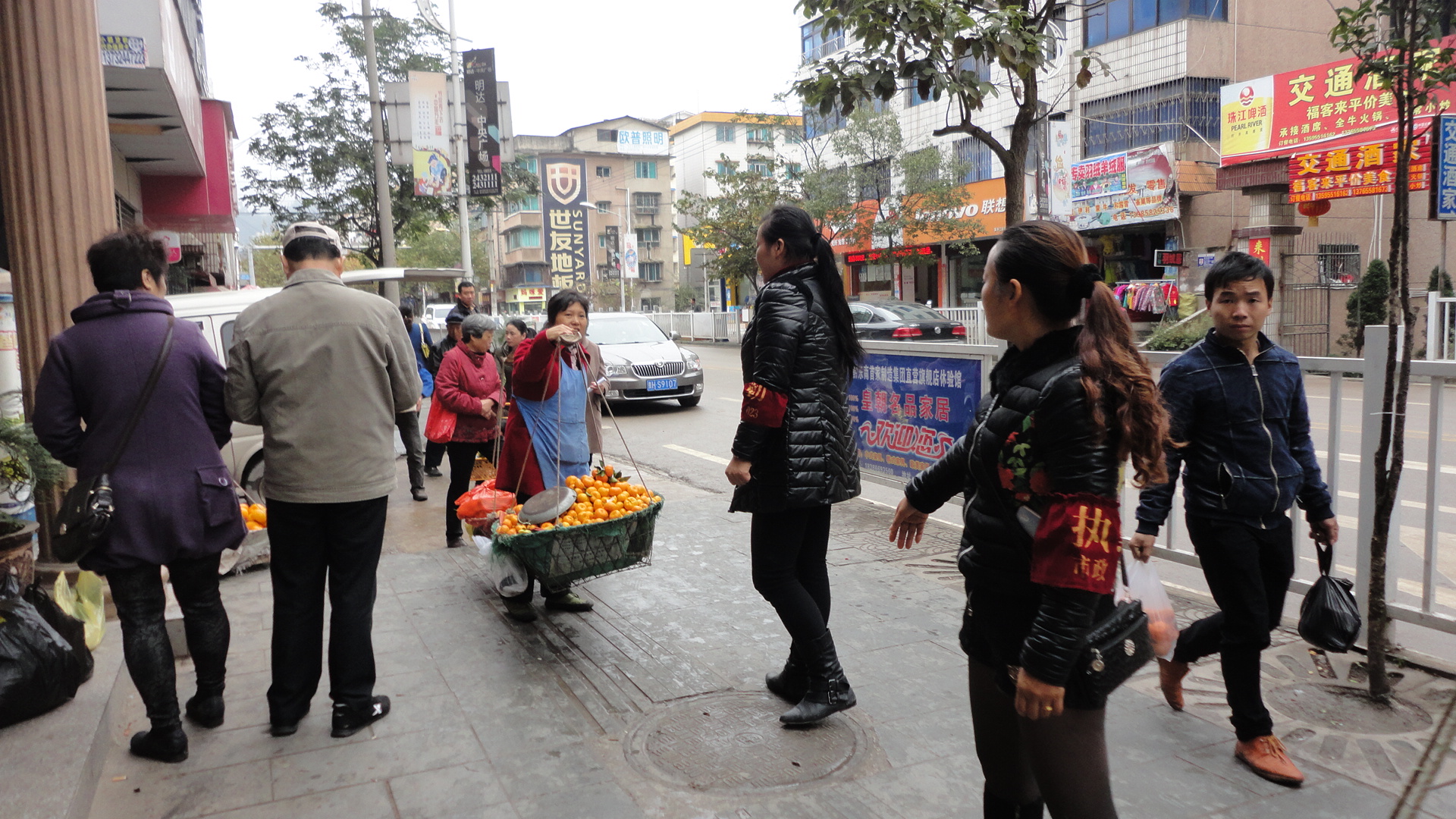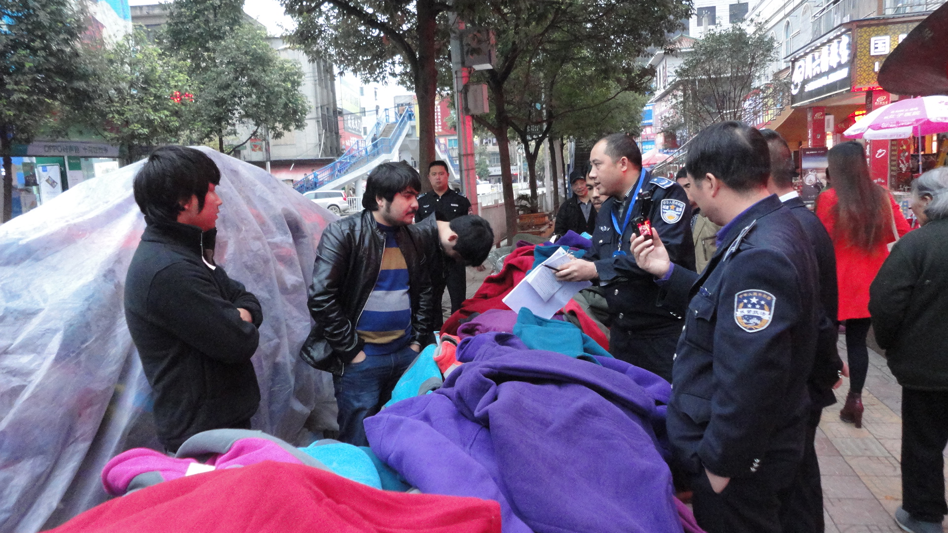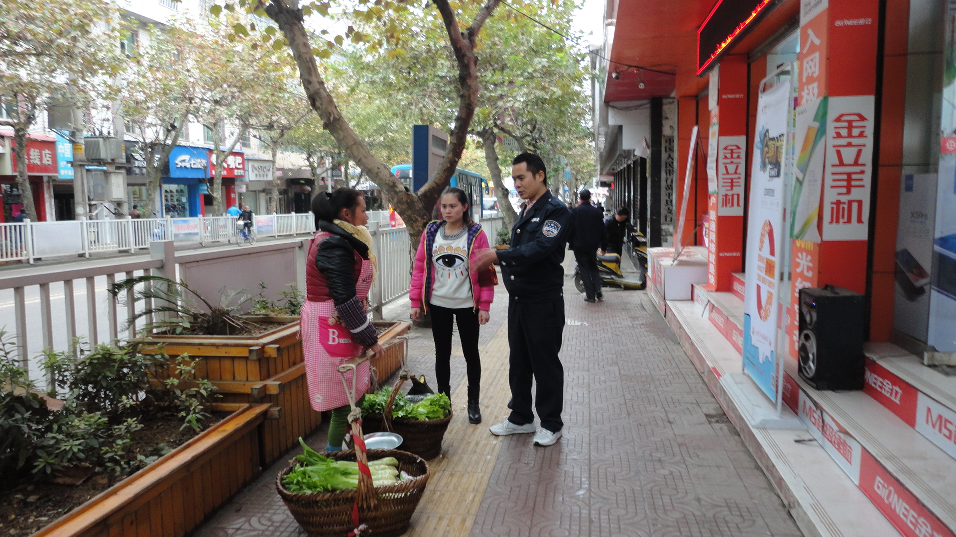 图为市政大队长杨建带领机动中队在对占道经营的外来客商进行教育疏导
