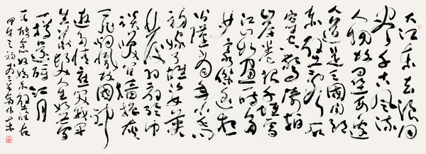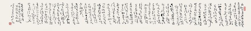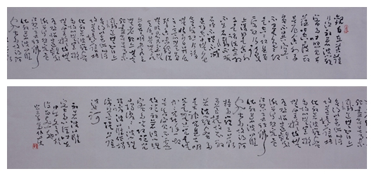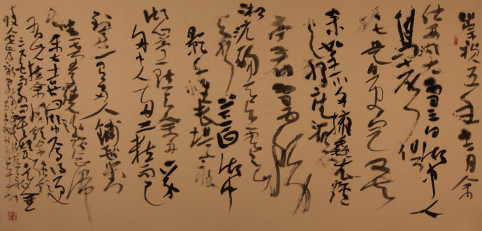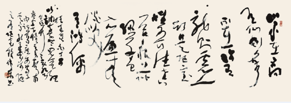 所作巨幅草书势大力沉,墨饱笔畅,草法谨严,字态威仪,点画生动,线质遒润,雄强豪迈之气韵通贯始终,弥漫全篇。若能于率意挥运中疾进徐行以增强韵律感,湿侵枯染以增强层次感,密布疏陈以增强空间感,则作品的感染力将大增无疑。