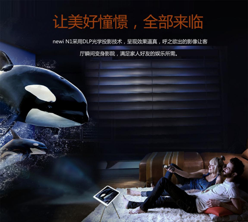 小身材大有可为——newi N1,颠覆创新,让工作从容不迫,轻松解决各种烦恼,可被感知的轻盈与优雅,移动办公,智简未来;家庭电影院,160寸巨幕,影院级视听感受;