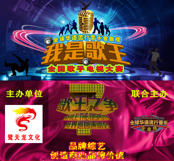 由鹭天龙文化传媒、全球华语流行音乐金曲榜联合主办的《歌王之争》全国巡演、全球华语流行音乐金曲榜《我是歌王》全国歌手电视大赛、即将开启,前三甲将会和天王天后同台演出暨参加《歌王盛典》颁奖盛典,并且有知名音乐人为其量身定制音乐作品,敬请期待!