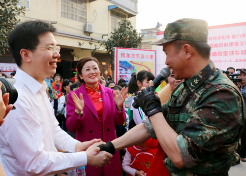 中华志愿者杂志(记者:许顺喜)报道,在全国“两会”隆重召开之际,中国人民解放军火箭军文工团著名军旅歌唱家、中国文艺志愿者协会理事金波为表达对全国“两会”召开的庆祝,怀着对伟大祖国感恩的心情,带着艺术家们对贫困村村民的关爱,于3月6日走进河南省第一个“中华孝心示范村”弯柳树村,进行公益慰问演出。