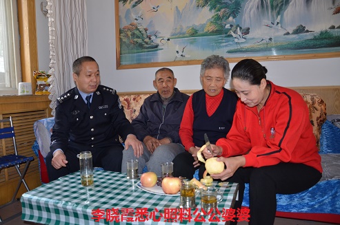 自从结婚那天起,李晓霞便多了一份对公安工作的理解和支持。深知丈夫工作强度大,为了能让丈夫安心扑在工作上,便毫无怨言地撑起了家中的半边天。家里有年过七旬的老人,她把这些家人长挂于心,经常打电话嘘寒问暖,老人们只要有需要,她都会在第一时间赶到。有一年寒冬腊月,公公和婆婆病重期间,她二话没说,把正在上学的儿子托付给孩子的姥姥和姥爷照看,自己一个人坐车去百里之外丈夫的老家照看二位老人,带着他们到医院看病;二位老人行动不便,她隔两天就帮他们用毛巾擦身;婆婆关节不好,李晓霞便亲手缝了一对护膝给婆婆穿上。对公公婆婆无微不至、悉心照料,警嫂李晓霞用火热的心诠释了孝道,彰显了半边天的无限风采。