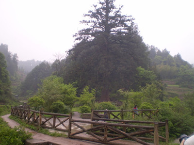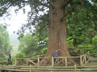 杉王位于习水县城北部10公里处 ,自驾车从县城出发约20分钟,也可在县城内合江车站乘坐旅游车辆,票价为3元,门票统一为10元每人次。杉王宛如一羞涩少女亭立于两山间,下车前往杉王还有一段路程,远眺杉王不觉其大。一路流水涓涓,鸟鸣幽幽,渐行渐近,转过一弯杉树豁然立于眼前,顿感慨其粗壮、高大(笔者幼时就曾有幸拥抱过杉王一次,12次合抱才将她抱完)。