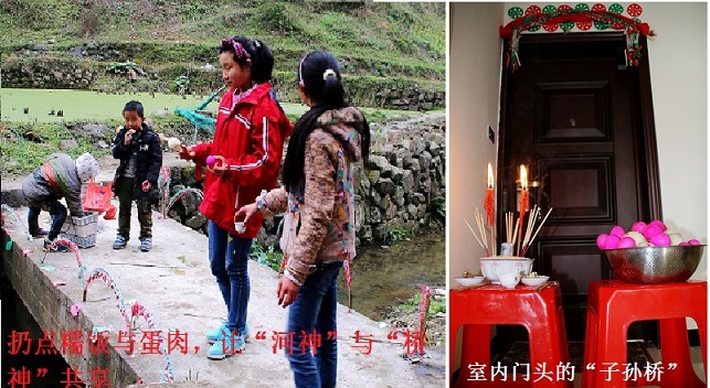 “热桥”祭祀,庇荫子孙。这种对行善积德的崇拜和追求,源于人们求子盼女心切的一种精神寄托,并通过这种“疲惫意识”去通过修桥补路和祭祀桥神后,心灵得到慰藉,以实现美好的“父母梦”和“子女梦”。如一些结婚多年未能生育的夫妇认为,自己没有生儿育女的原因,可能是对社会付出的功德不够而造孽。为了早日实现为父作母的愿望,他们就选定在农历二月间的某个黄道吉日,于人畜难过的沟壑上,或雄奇的岩石下,或茂密的古树中,或室内外架铺“子孙桥”,供人们行走,并希望通过虔诚的行为来感化“神灵”,使“神桥”或“路神”赐予未育夫妇子女,达到早生贵子的目的。