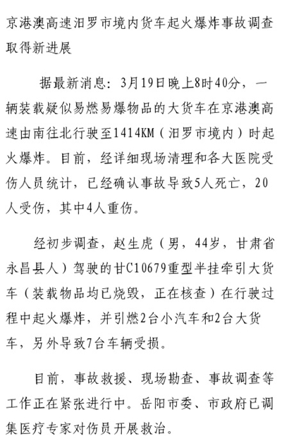 备份栏目人民网3月20日电 据湖南省高速公路交通警察局官方微博“@湖南高速警察”消息,3月19日晚上8时40分,一辆装载疑似易燃易爆物品的大货车在京港澳高速由南往北行驶至1414KM(湖南汨罗市境内)时起火爆炸。目前,经详细现场清理和各大医院受伤人员统计,已经确认事故导致5人死亡,20人受伤,其中4人重伤。