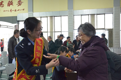 清风网讯:2016年3月25日上午,包头铁路公安处举办了“中国梦,孝先行”孝心手环发放活动。本次活动共计向包头公安处离退休老干部发放手环350条,参加活动的民警共计80余人。青年民警为铁路公安事业奉献了一辈子的离退休老民警及老民警家属一一戴上了孝心手环,将爱心传承,将孝心发扬,营造了浓厚的尊老爱老氛围。