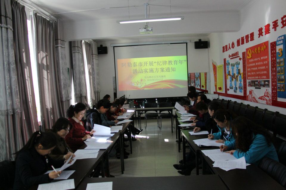 清风网讯:(通讯员 王磊)2016年阿勒泰市确定为“纪律教育年”,围绕社会稳定和长治久安总目标,坚持把纪律和规矩挺在前面,坚持高标准和守底线相结合,深入开展纪律教育工作。金山路社区于 5月11日下午组织全体干部学习《阿勒泰市开展“纪律教育年”活动实施方案》的具体内容。