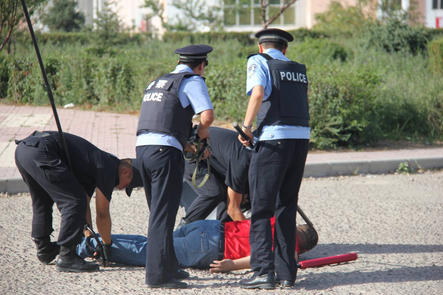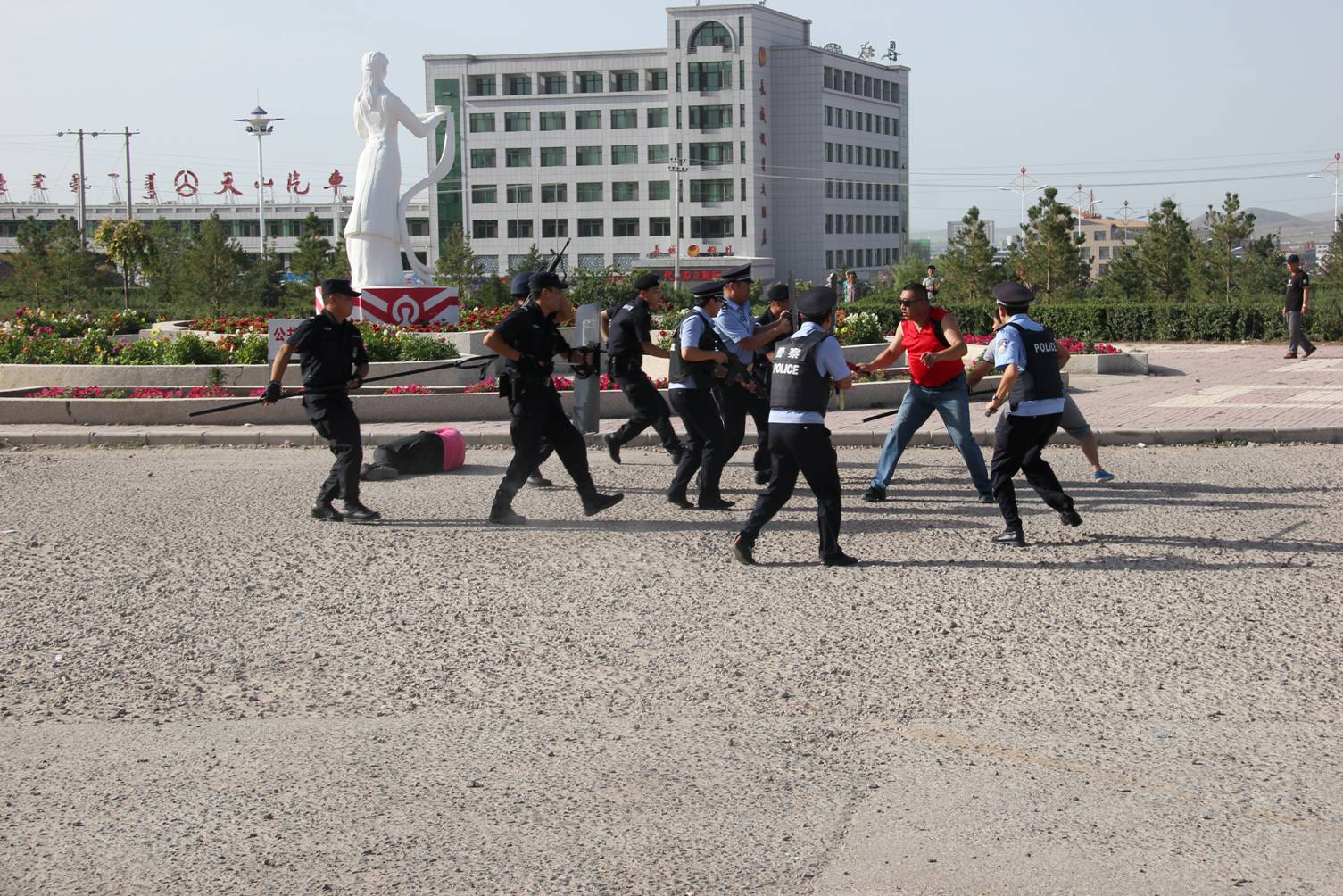 演习情景,查布嘎车站站前广场2名恐怖分子手持斧头、棍棒砍杀旅客,派出所民警先期处置并向联勤联动办公室特警执勤中队请求火速增援;安检员和车站职工引导疏散旅客;联勤联动特警值班中队2台特警巡逻车、特警9人携带全副武器装备迅速到达现场,民警与特警队员互相配合,使用防暴盾牌掩护并接近犯罪嫌疑人,其余民警及特警队员使用防暴叉、抓捕器合力将1名犯罪嫌疑人摁倒并上前进行抓捕、搜身、带离;另1名犯罪嫌疑人顽抗拒捕、严重危及周围群众及民警生命安全,经民警口头警告、鸣枪警告无效后果断开枪击毙。