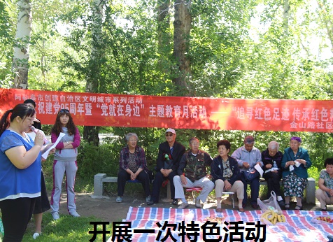 金山路社区党委以“忆党史 念党恩 跟党走”为主题,开展庆祝建党95周年活动。在平房区发展的第一个“红细胞”工程基地——“红色庭院”——老党员木合买提·肉孜家中,金山路社区党委进行了一次特殊的座谈,住在附近的10余名党员一同回忆党的历程,感恩党为大家带来的幸福生活。