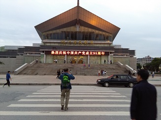 95周年活动,唱红歌、演讲、座谈、表彰、重走长征路、纪念革命先烈等精彩纷呈活动,在珠江源头形成一片爱党爱国的赤城。图为在人口密集区珠江源大剧院展现的电子屏幕标语。
