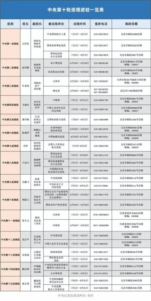 7月7日,中央纪委监察部网站公布了十八届中央第十轮专项巡视进驻全国人大机关(含全国人大常委会办公厅,法制工作委员会,预算工作委员会,香港、澳门特别行政区基本法委员会,办公厅研究室等单位),全国政协机关(含全国政协办公厅、办公厅研究室等单位),中央统战部、中央机构编制委员会办公室、中央直属机关工作委员会、中央国家机关工作委员会、中央防范和处理邪教问题领导小组办公室、外交部、公安部、国务院侨务办公室、国务院港澳事务办公室、中央社会主义学院、中国人民对外友好协会、中国国际贸易促进会、中国人民外交学会等单位党组织开展专项巡视工作的情况。至此,中央第十轮巡视已进驻完毕。