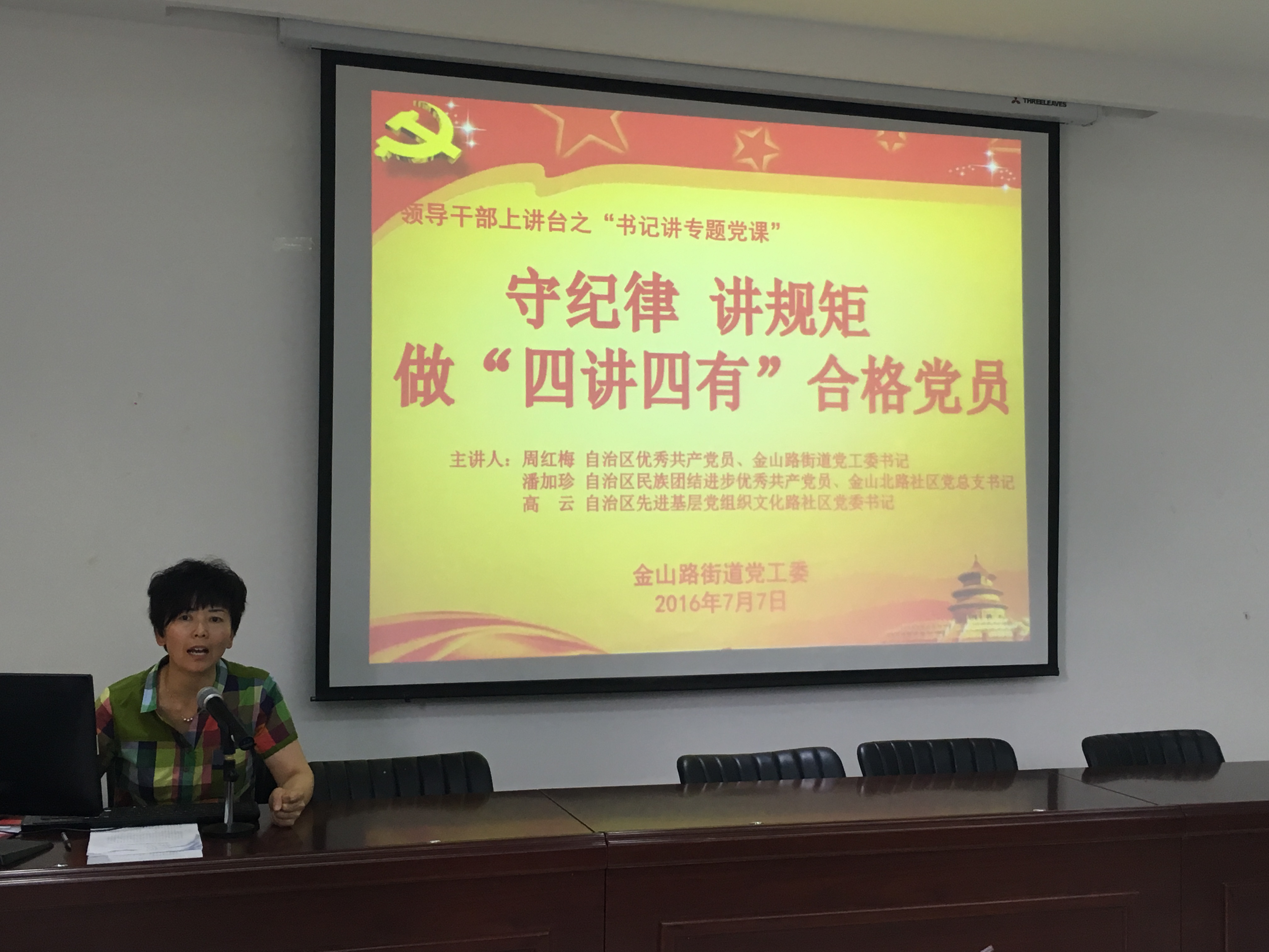 清风网讯:(通讯员 周文静)根据“两学一做”学习教育文件精神,为更好地发挥党员作用,7月6日下午,金山路街道办事处在文化路社区举办了书记讲党课学习会,街道党工委书记周红梅、社区书记潘加珍、高云围绕“守纪律、讲规矩、做‘四讲四有’合格党员”进行讲解。