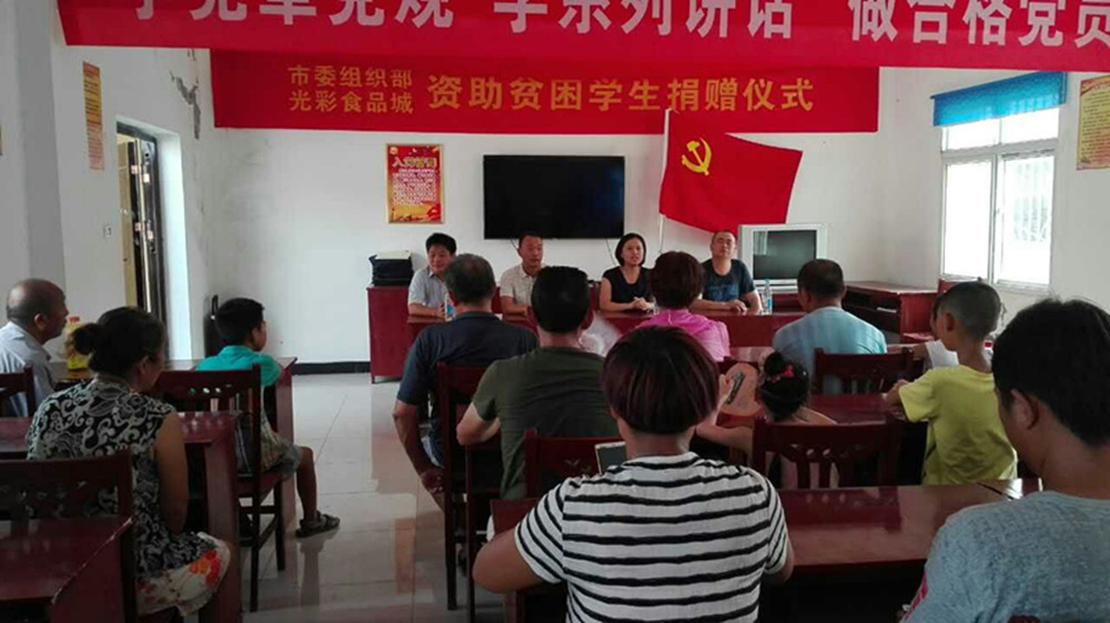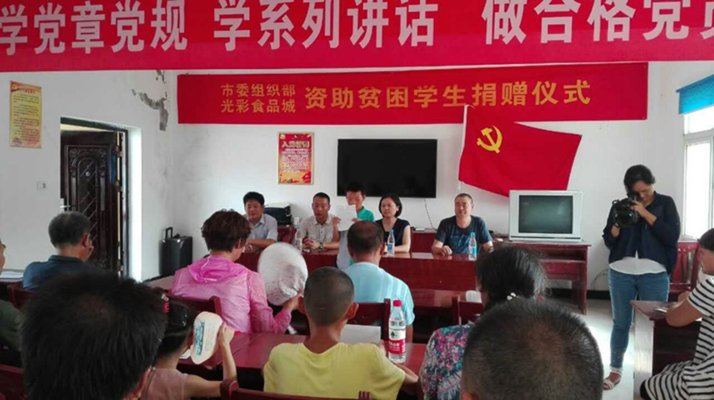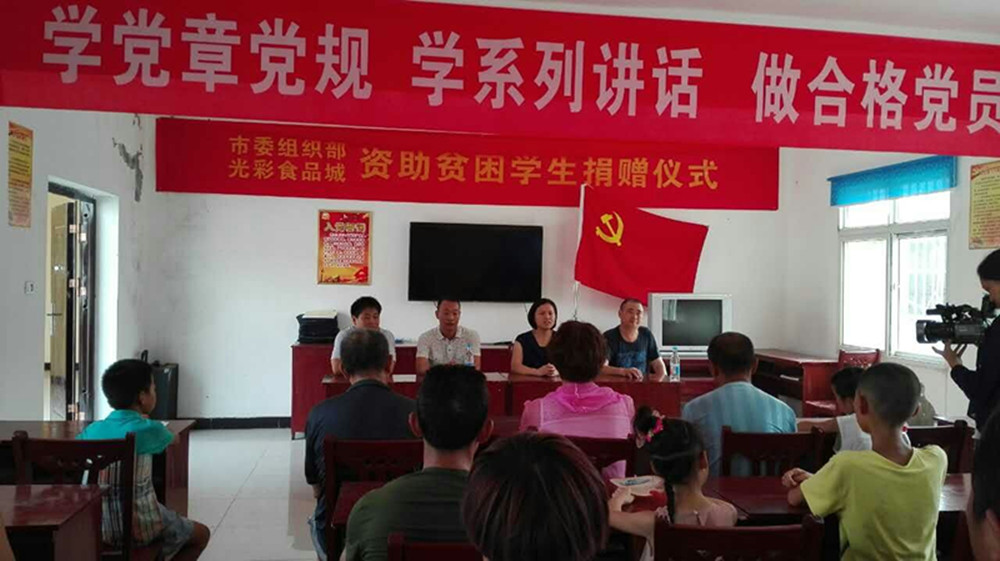 当天下午三时,当阳光彩食品城总经理林鹤在市委组织部副部长马学东、两河镇党委书记、人大主席王君莉的陪同下来到贫困村孙场村,向9名(2名大学生、2名高中生、5名小学生)贫困学生现场发放捐资助学款3万元。受助学生任靖云代表9名受助学生在发言中说“我们一定要好好读书,将来努力改变家乡面貌,来报答林叔叔!”