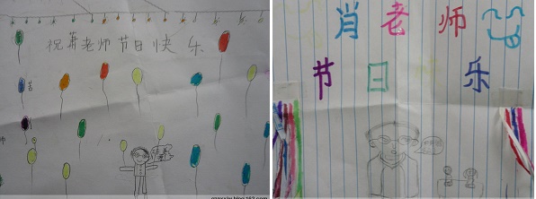 2008年7月,已经大学毕业一年余了,在生计忙碌的空隙,我整理书堆,再次端详了这份教师节礼物,是孩子们用草稿纸画的漫画。一幅画的顶端画了一串闪烁的彩灯,中间画满了飘飞的彩色气球,彩灯与气球之间写了一句话“萧老师节日快乐”,画的底部居中画上一个带着眼镜的老师,张开双臂感叹着一句话“好美啊”。另一幅画是在中上部分用彩色笔写上“肖老师节日快乐”,中部的两边贴上了对称的两束彩色纸带,下部的中间画着一个带着眼镜的老师,老师旁有男女两个小学生坐在课桌上学习,老师在说一句话“好好做作业”。看着这两幅画,感动不已,孩子们天真可爱,想象丰富,他们所画的带着眼镜的老师,正是观察了我的形象。为了便于翻看,我将这难忘的礼物拍照上传到博客里。