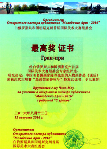我国著名国画家、中央美术学院教授、美院国画系原主持教学工作的主任-陈谋教授的国画作品《课后》经白俄罗斯世界美术大赛组委会专家组进行严格的评审通过,最终荣获此次世界美术大赛的最高奖荣誉称号!