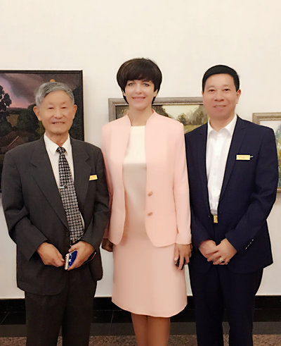 白俄罗斯议会科教文卫体主任、世界美术大赛组委会主席萨罗卡与陈谋、刘瀚锴亲切交流并合影留念