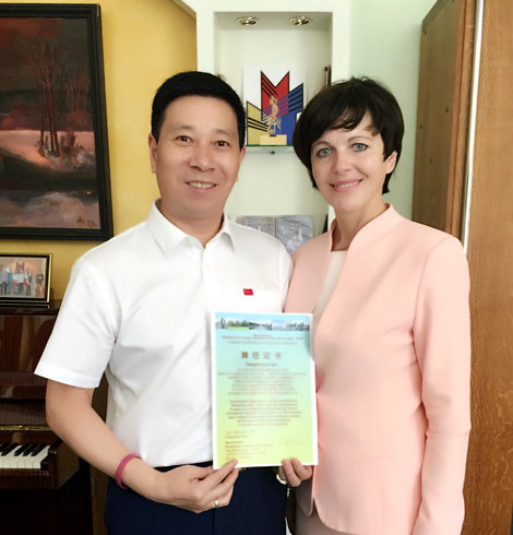白俄罗斯共和国议会科教文卫体主任、明斯克州国际艺术大展组委会主席萨罗卡,向刘瀚锴颁发聘书并合影留念