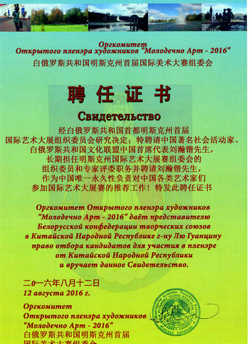 明斯克国际艺术大展组委会向刘瀚锴先生颁发的聘任证书