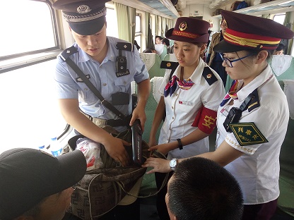 图为9月8日该支队Z336次旅客列车(包头至南宁)各警组在车厢开展全面安全检查工作