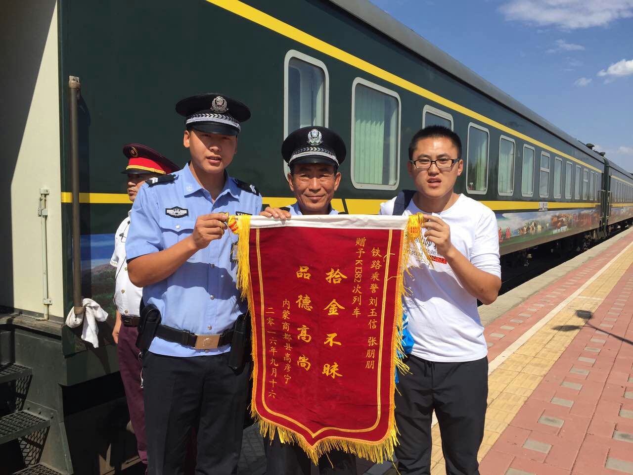 9月16日中午3点04分,列车从哈尔滨返回途经商都站时,在车站派出所执勤民警的陪同下,来到车站接车。在接过失而复得衣物、钱包的同时,将一面特意制作的写有“拾金不昧,品德高尚”字样的锦旗,交到乘警长刘玉信手中。