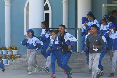 演练中,为防止学生疏散时发生踩踏拥挤等事件,活动在教学楼各楼层拐弯处和楼梯口设置了一名安全员,维持疏散时的秩序。地区第一高级中学每年9月18日都会组织全校师生开展一次防空防灾应急疏散演练。