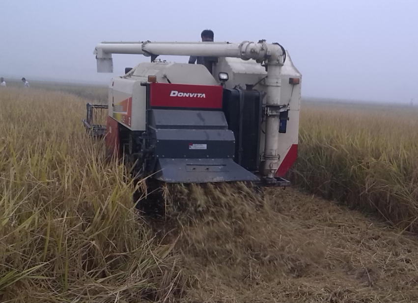 图为机手正在机收水稻助农抢收
