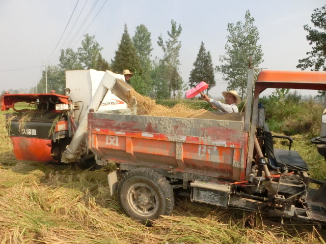 图为农民正在将收割旳稻子放到车里